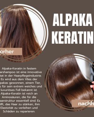Das Herzstück unseres Shampoos ist das hochwertige Alpaka Keratin, gewonnen aus der Alpakawolle durch ein spezielles Siedeverfahren. Dieses natürliche Protein ist bekannt für seine pflegenden Eigenschaften, die Ihr Haar kräftigen und ihm einen natürlichen Glanz verleihen.