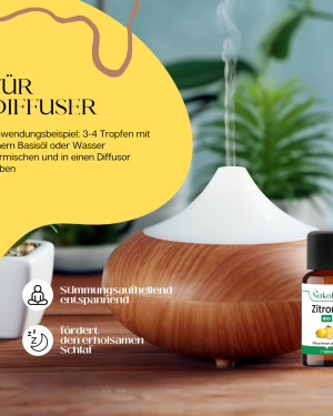 • Verdampfen Sie das Zitronenöl in einem Diffuser, um eine erhebende und stimmungsaufhellende Atmosphäre in Ihrem Zuhause zu schaffen.